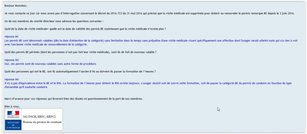 Je vous contacte ce jour car nous avons pas d’interrogation concernant le décret du 2016-723 du 31 mai 2016 qui précise que la visite médicale est supprimée pour obtenir ou renouveler le permis remorque BE depuis le 3 juin 2016.