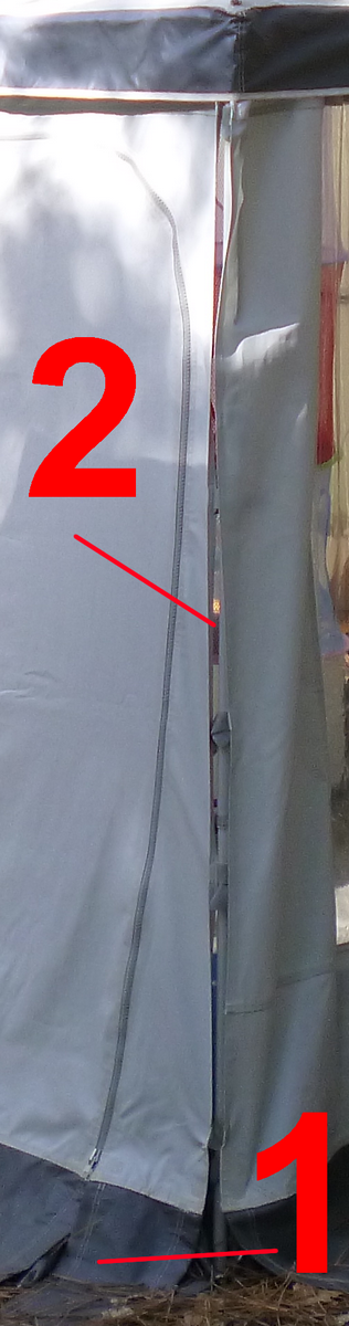 Objectif : coudre une bande de 30 cm de large au coin du toit solette soplair. Les joues latérales laissent passer l'eau au niveau des coins (attache par velcro simple 2 sur la photo). Pour la hauteur : celle des joues + un poil pour la couture.